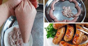 Đầu tiên phải chọn thịt và mỡ còn tươi nóng. Sau đó làm sạch và cho vào cối xay cùng các gia vị, phụ gia. Chú ý mọc cần phải dẻo và còn bóng tránh tình mọc xay quá nhiệt bị bở và khô. Sau khi xay xong thì nhồi vào vỏ collagen đến khi hết thì thôi. Vỏ collagen này có thể cắt rời nếu không dùng hết nhé! Và một bí quyết nhỏ để tránh tình trạng xúc xích bị bục vỏ đó là sau khi nhồi xong, bạn nhớ dùng tăm nhọn xăm sơ lên xúc xích nhé!